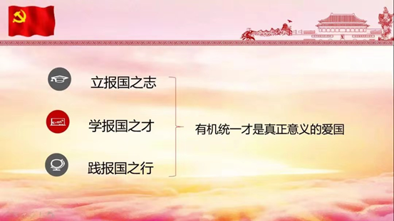 最后,他给我们阐述了有关“爱国主义教育”这一方面的内容。首先,他向同学们介绍了爱国主义的基本内涵和基本要求。接着,便从”知国、爱国、报国“三个方面重点讲解如何践行爱国主义。最后,他还鼓励同学们积极投身于爱国主义教育行动,要懂得知国、爱国和报国。