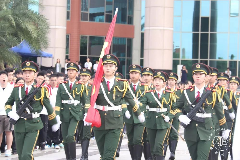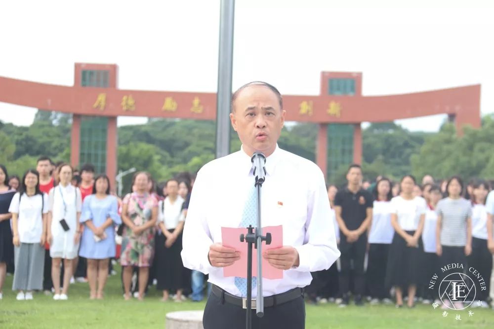 校党委苏宁书记致辞。他表示,本次升国旗、唱国歌、向国旗敬礼的实践活动意在进一步加强我校爱国主义教育、激发师生爱党爱国的热情。他指出,今年正值新中国成立70周年。70年来,在中国共产党的正确领导下,新中国取得了举世瞩目的成就;同时今年也是华商成立第十四周年。十四年来,学校在董事会的正确领导下,办学迈向了新的台阶并在2019年广东当代优质民办学校评选表彰活动中荣获“当代民办学校突出贡献奖”。他最后向同学们提出三点希望:一是要强本领,敢担当勇做走在时代前列的奋斗者;二是要强品德、敢作为,勇做走在时代前列的奋斗者;三是要强信念、敢创新,勇做时代走在时代前列的开拓者。