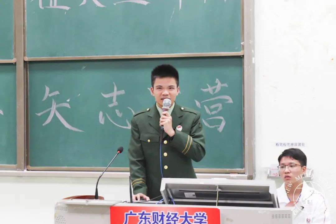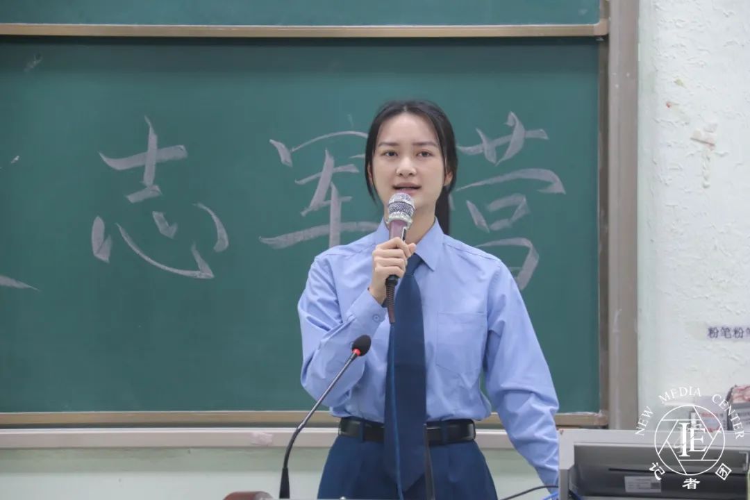 杨智超同志发言。属于空军一员的她,杨智超同志以自己的亲身经历告诉同学们,一名女兵的日常训练,面对困难的不惧,体现了巾帼不让须眉,让同学们都感受到了女兵们的英姿飒爽的气质。