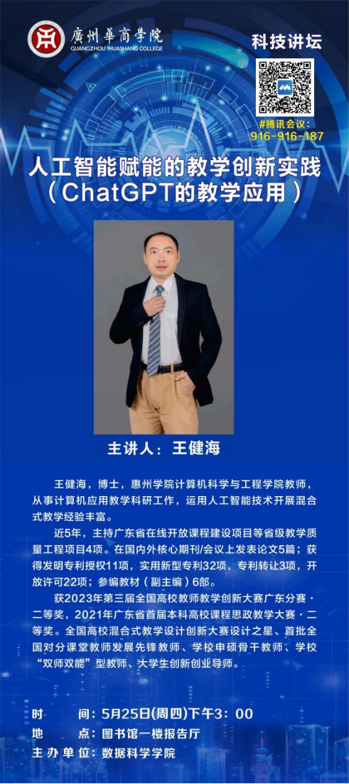 2023年5月25日,广州华商学院数据科学学院邀请到惠州学院计算机科学与技术学院王健海博士为师生们做了一次精彩的讲座。本次讲座的主题为“人工智能赋能的教学创新实践”,王博士以《数字逻辑》为例,结合他运用ChatGPT在课程教学创新所取得的实践经验,深入浅出地探讨人工智能技术在教育领域的应用和未来发展趋势。该讲座受到了广大师生的热烈欢迎。