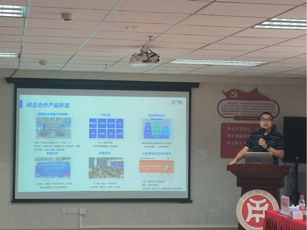 深圳市腾讯计算机系统有限公司高教中心南区市场总监李伟光作主题发言,介绍了腾讯企业的发展历程、企业数字化转型过程、云与智慧产业事业群及腾讯教育等领域的运营现状。他指出,腾讯公司立足深圳积极承担社会责任,深入推进校企合作,致力于为社会培养更多优秀的人才。