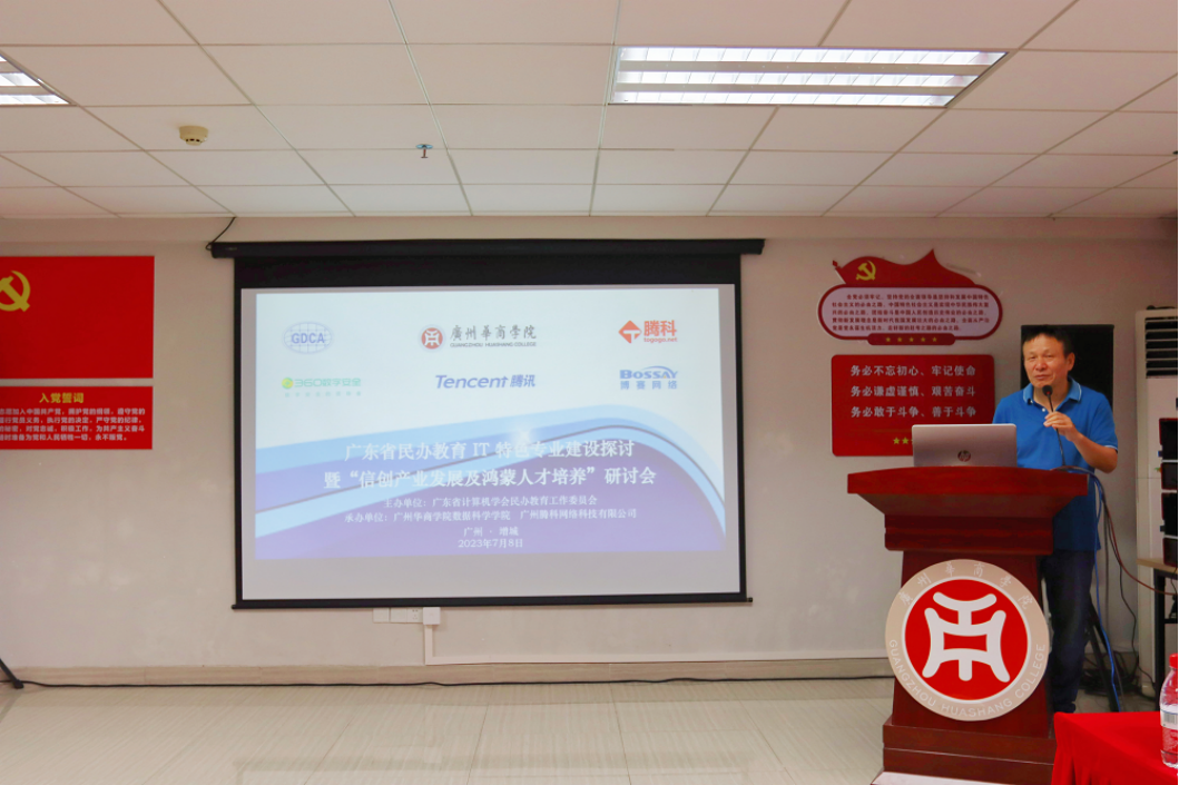 2023年7月8日,由广东省计算机学会民办教育工作委员会主办,广州华商学院、广州腾科网络技术有限公司承办,360数字安全科技集团有限公司、深圳市腾讯计算机系统有限公司、济南博赛网络技术有限公司协办的“广东省民办教育IT特色专业建设暨信创产业发展及鸿蒙人才培养”研讨会在广州华商学院行政楼502会议室顺利召开。
