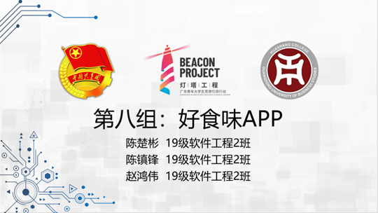 第八组:好食味APP,来自19级软件工程2班的陈楚彬,陈镇锋,赵鸿伟。该组选手的app详细介绍美食的教程,用户可以在这里面找到自己喜欢的美食,学习如何烹饪美食,他们表示希望能通过此款app让大家的厨艺更上一层楼。