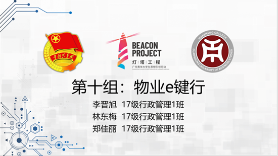 第十组:物业e键行,来自17级行政管理学1班的李晋旭,林东梅,郑佳丽。选手表示此款软件可以通过社区服务,线上缴费,生活周边,废品收类来实现人们对自己生活一点一点深入了解,也教会我们如何去维护自己的利益。
