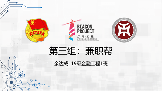 第三组:兼职帮,来自19级金融工程1班的余达成。余达成同学介绍了当下兼职存在的普遍情况并从不同方面帮助同学们了解不同兼职所需要注意的情况,此款app可以帮助大家找到正规的商家,防止同学们被不良商家欺骗,减少不必要的损失。