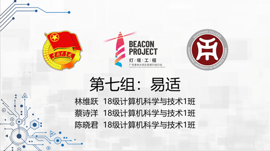 第七组:易适,来自18级计算机科学与技术1班的林维跃,蔡诗洋,陈晓君。该组选手先是介绍了他们app的构成:特色展示,线上定制,购物车,个人中心。接着通过线上试穿来选择最适合自己的衣服。在这款app中有不同的人体模型,消费者可以选择最适合自己的一款模型,方便用户从不同的角度去体验属于自己的穿衣效果。