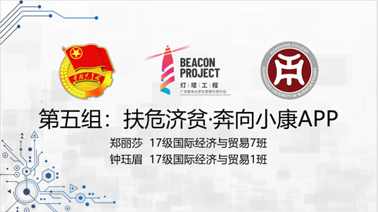 第五组:扶危济贫·奔向小康APP,来自17级国际经济与贸易7班和1班的郑丽莎,钟珏眉。他们从软件概念、互联网下精准扶贫、特色网络平台、开创目标来介绍此软件,并分析了此产品的前景市场以及如何去运营和推广,最后介绍了它所需要的成本和所带来的利润。