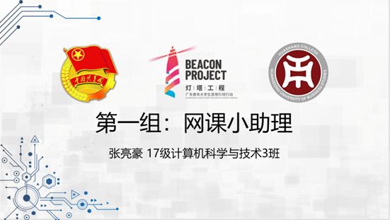 第一组:网课小助理,来自17级计算机科学与技术3班的张亮豪。张亮豪同学针对此次疫情期间大家普遍上网课的情况,设计出一个网课小程序。网课小程序仅需要输入个人的学号和上课的时间,便可以快速获得微信提醒上课、课程签到、跳转上课页面等服务。