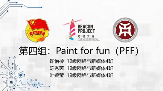 第四组:Paint for fun(PFF),来自19级网络与新媒体4班的许怡柃,陈秀茵,叶婉莹。该组选手从平台专门认证、平台课程分析、网上商城和PFF社务的四大方面介绍软件。该软件坚持图形用户界面,界面直观,对用户透明,使用户接触软件后对界面上对应的功能一目了然。