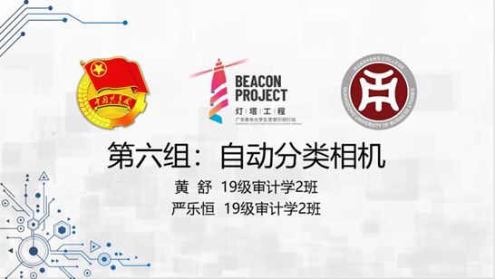 第六组:自动分类相机,来自19级审计学2班的黄舒,严乐恒。此组选手从法律,经济,开发环境,操作,技术来证明自动分类相机这一app设计的可行性。他们表示此款app专门针对现实所需分别推出了智能查找以及智能分类的功能,喜欢拍照的同学就不用再为一张张去寻找自己想要的图片而烦恼了。