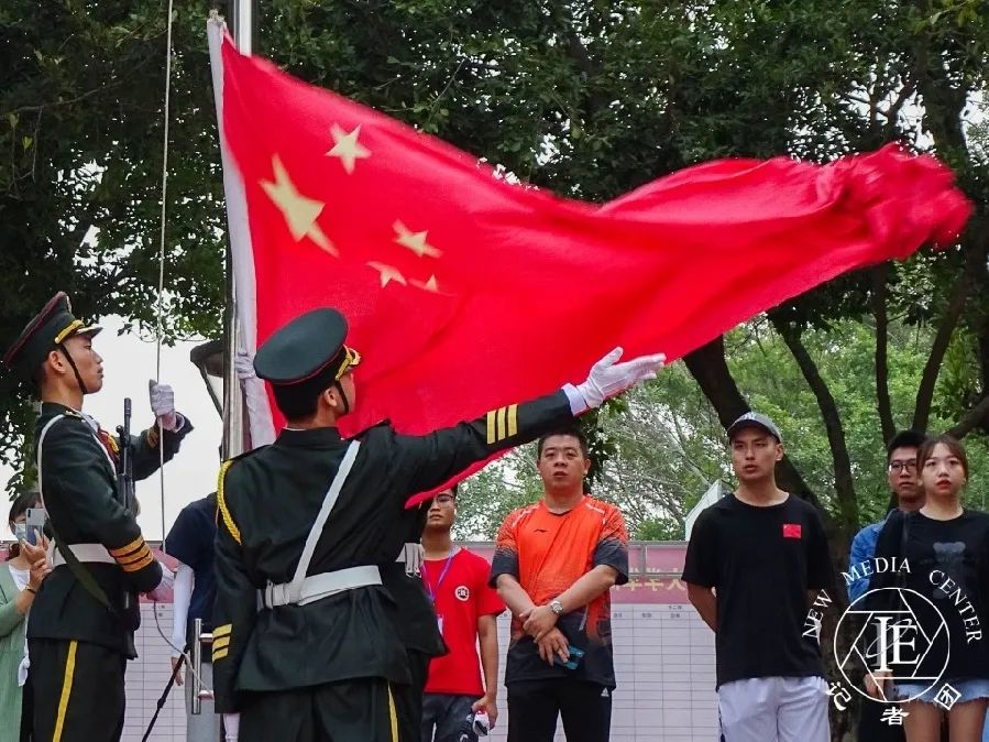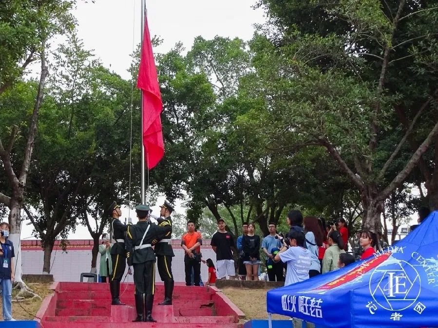 伴着朝阳,国旗在国歌的指引下缓缓升起,屹立于华商上空。广东财经大学华商学院第十一届校运会开幕式随即开始。