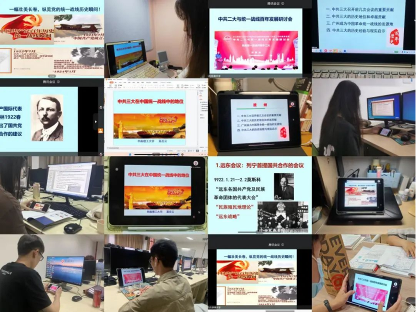 数据科学学院学生第五党支部组织全体党员线上收听收看本次莫岳云教授讲授的《中共三大在中国统一战线中的地位》的专题辅导,莫岳云教授向我们深入讲述了中共一大与中共二大的主要贡献,之后又着重强调了中共三大最突出的贡献是统一战线等方面的内容。统一战线是我们党凝聚人心、汇聚力量的政治优势和战略方针,也是战胜敌人的三大法宝之一。学生第五党支部全体党员通过本次专题辅导学习,意识到要深刻理解发展壮大新时代爱国统一战线的重大意义,准确把握新时代爱国统一战线的历史方位,以高度的使命感和责任感做好工作,凝聚团结奋进正能量!