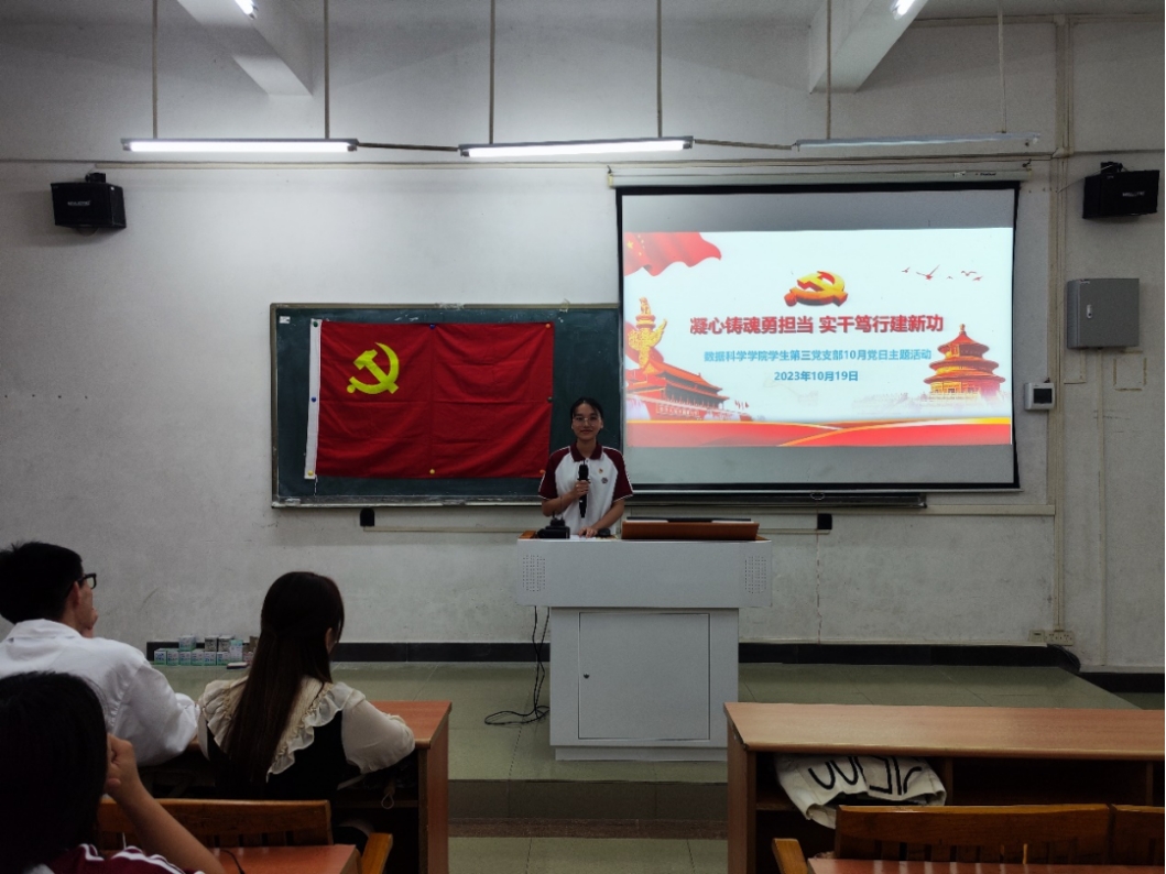 为紧紧围绕新时代新征程中国共产党的中心任务,准确全面贯彻新发展理念,学习贯彻习近平总书记重要讲话精神,坚定不移走中国特色社会主义道路。数据科学学院学生第三党支部于2023年10月19日17:50在励志楼D102开展“凝心铸魂勇担当,实干笃行建新功”党日主题活动。出席本次会议的有数据科学学院学生第三党支部书记吴诗雨老师、支部全体党员,会议由丘润梅同志主持。