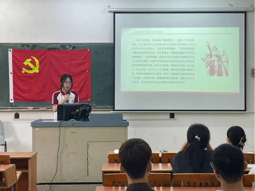陈炽堃同志对本次党日主题活动做了总结讲话,指出我们作为学生党员干部,要深入贯彻落实党的二十大精神,深刻领悟“两个确立”的决定性意义,增强“四个意识”、坚定“四个自信”、做到“两个维护”,在未来的征程上,要坚定文化自信、秉持开放包容、坚持守正创新,更好担负起新的文化使命,共同努力创造属于我们这个时代的新文化,建设中华民族现代文明,赓续历史文脉,谱写当代华章。