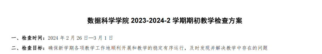 新学期伊始,万象更新,欣欣向荣。为进一步规范教学管理,全面掌握教学运行状况,确保新学期课堂教学工作正常、有序地开展。根据学院学期初教学检查方案总体部署,2月26日,数据科学学院领导班子、全体辅导员以及部分专任老师深入教学一线,检查新学期开课师生们的精神面貌和课堂教学开展情况。