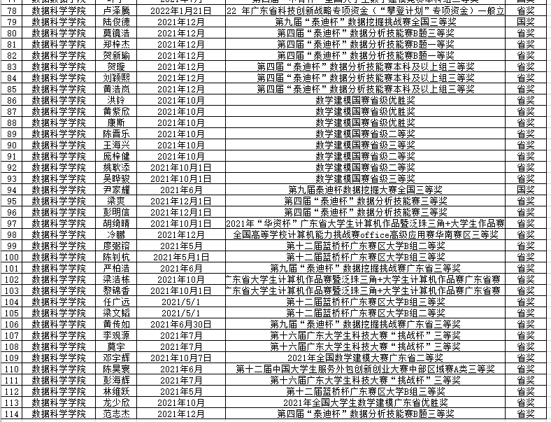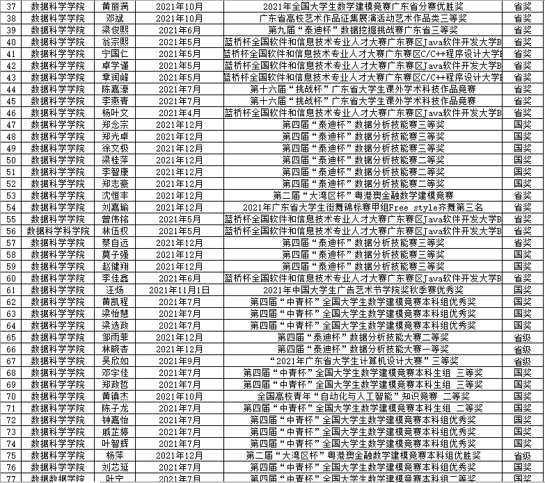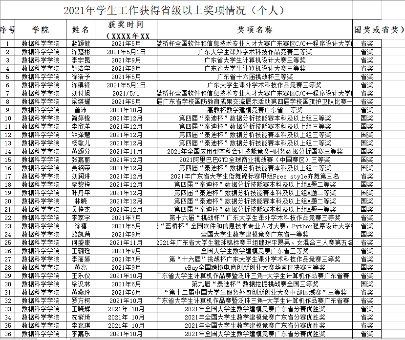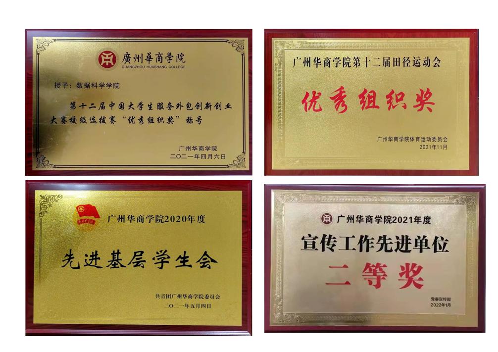 数据科学学院通过多维度教育全方位育人,培养德智体美劳全面发展的大学生,营造健康向上、文明和谐的校园氛围,促进学生学习与发展。2021年无论是集体还是学生个人都取得了丰硕的成果,其中国家级获奖人数37人,省级获奖人数77人,获得国家奖学金2人、国家励志奖学金70人、校优秀学生干部49人、校优秀学生262人。