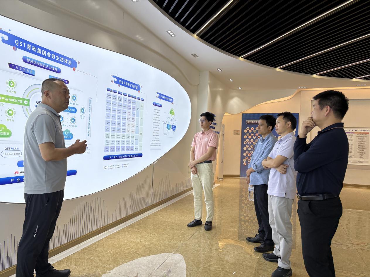 活动伊始,李刚副总裁引领广州华商学院代表团参观了青软集团的展厅详细介绍了QST青软集团的业务生态体系,重点阐述了服务区域新兴产业发展的两大板块——产业学院集群和产教融合基地。在产业学院集群方面,青软集团通过“平台+内容+服务”模式提供全方位支撑,并展示了专业共建教学运营图,该模式经过8个学期的实践运行已日趋成熟。在产教融合基地方面,青软集团创新性地构建了产业学院共建业务模式,通过整合企业、政府和学校三方资源,形成优势互补的协同发展格局,为区域经济发展和人才培养提供了有力支持。