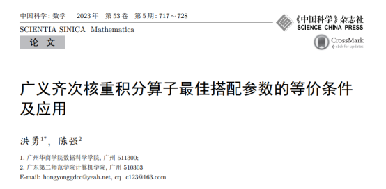 近日,我院教师洪勇的论文“广义齐次核重积分算子最佳搭配参数的等价条件及应用”在我校认定的A1类《中国科学:数学》期刊上发表。 《中国科学:数学》是中科双高期刊,连续多年获“百种中国杰出学术期刊”称号,(2022版)复合影响因子:0.794,(2022版)综合影响因子:0.509。该刊主要报道基础数学、应用数学、计算数学与科学工程计算、统计学等方面具有重要意义的研究成果。