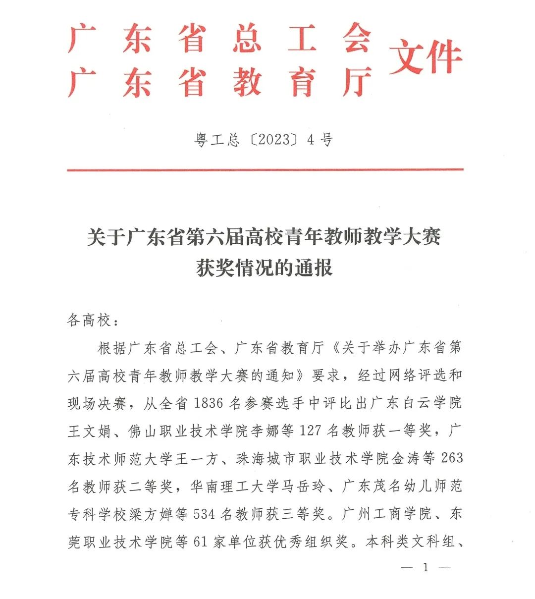 2023年2月8日,广东省总工会、广东省教育厅公布了关于广东省第六届高校青年教师教学大赛获奖情况的通报,我校教师周国辉获文科组三等奖、何璐琪获工科组三等奖、贺艳春获工科组三等奖。 硕果累累承荣誉,砥砺奋进创佳绩!我们将以荣誉作为前进的动力,充分发挥优秀教师模范作用,推动学校教育教学再上新台阶,助力学校持久发展!