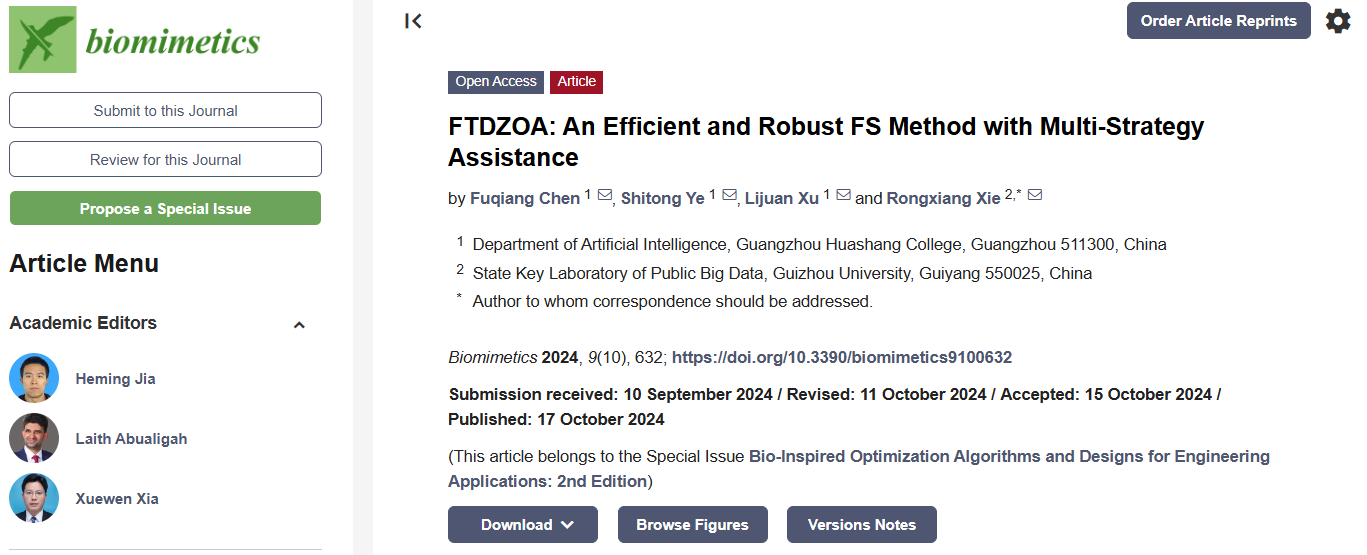 近日,人工智能学院教师陈富强以第一作者身份在《Biomimetics》期刊发表了题为“FTDZOA: An Efficient and Robust FS Method with Multi-Strategy Assistance”的论文,该期刊属于SCIE检索期刊,是JCR Q1分区,中科院三区。