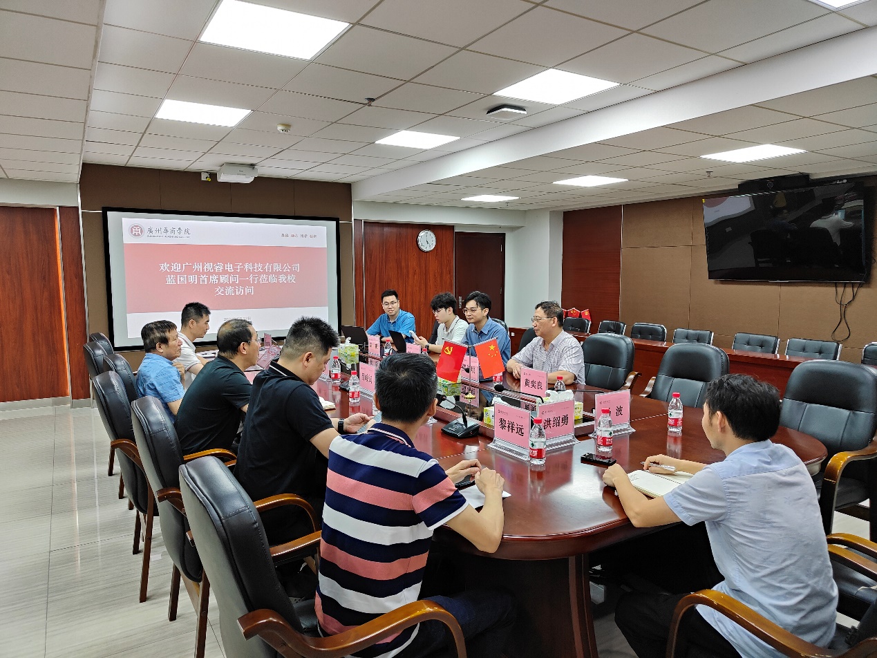 广州华商学院副校长吕峻闽教授主持会议,校方参会人员包括华商教育集团信息技术中心总监廖青、校产教办副主任唐显锋、教学督导赖庆、校实验教学与网络技术管理中心主任曾志区、校实验教学与网络技术管理中心科长黎祥远、人工智能学院副院长杨波及人工智能系副主任洪绍勇等。广州视睿电子科技有限公司首席顾问蓝国明先生带领其团队出席,共同探讨合作事宜。