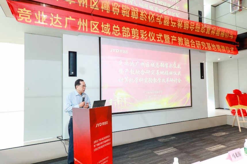 会议的第二阶段是嘉宾致辞,广东金融学院原党委副书记、广州新华学院副校长马龙海、广东省高等教学学会常务副会长、研究员汤贞敏、北京竞亚达数码科技股份有限公司副总裁李文波等分别致辞。祝贺广东省计算机学科实验教学改革研讨会的顺利召开,祝贺北京竞亚达数码科技股份有限公司产教融合研究基地顺利揭牌。