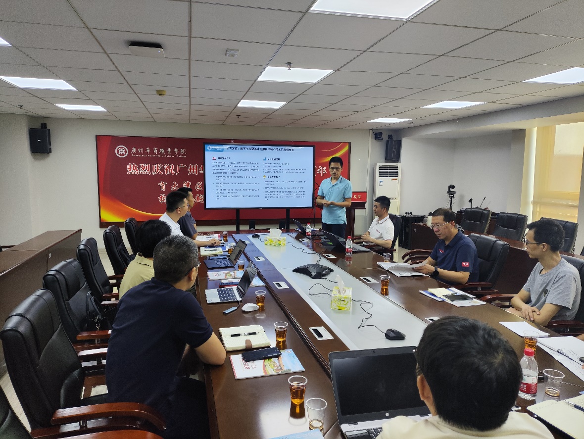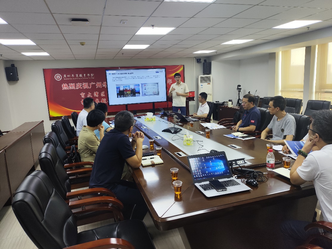在暑假期间,从7月下旬前期人工智能学院组织计划讨论的主题、企业组织拟定合作方案,8月初制定会议议程与联系人员组织会场,此次会议的召开得到校企双方的高度重视,会议由人工智能学院产教融合专员徐胜超主持。多位校内领导与教师参与,包括广州华商学院副校长吕峻闽、华商教育集团信息技术中心总监廖青,人工智能学院院长助理兼计算机系副主任杨本胜、人工智能学院人工智能系副主任霍永良、人工智能学院产教融合专员徐胜超。此外,还有北京联合伟世股份有限公司、广州锦行网络科技有限公司、广州掌动智能科技有限公司等三个企业的代表。